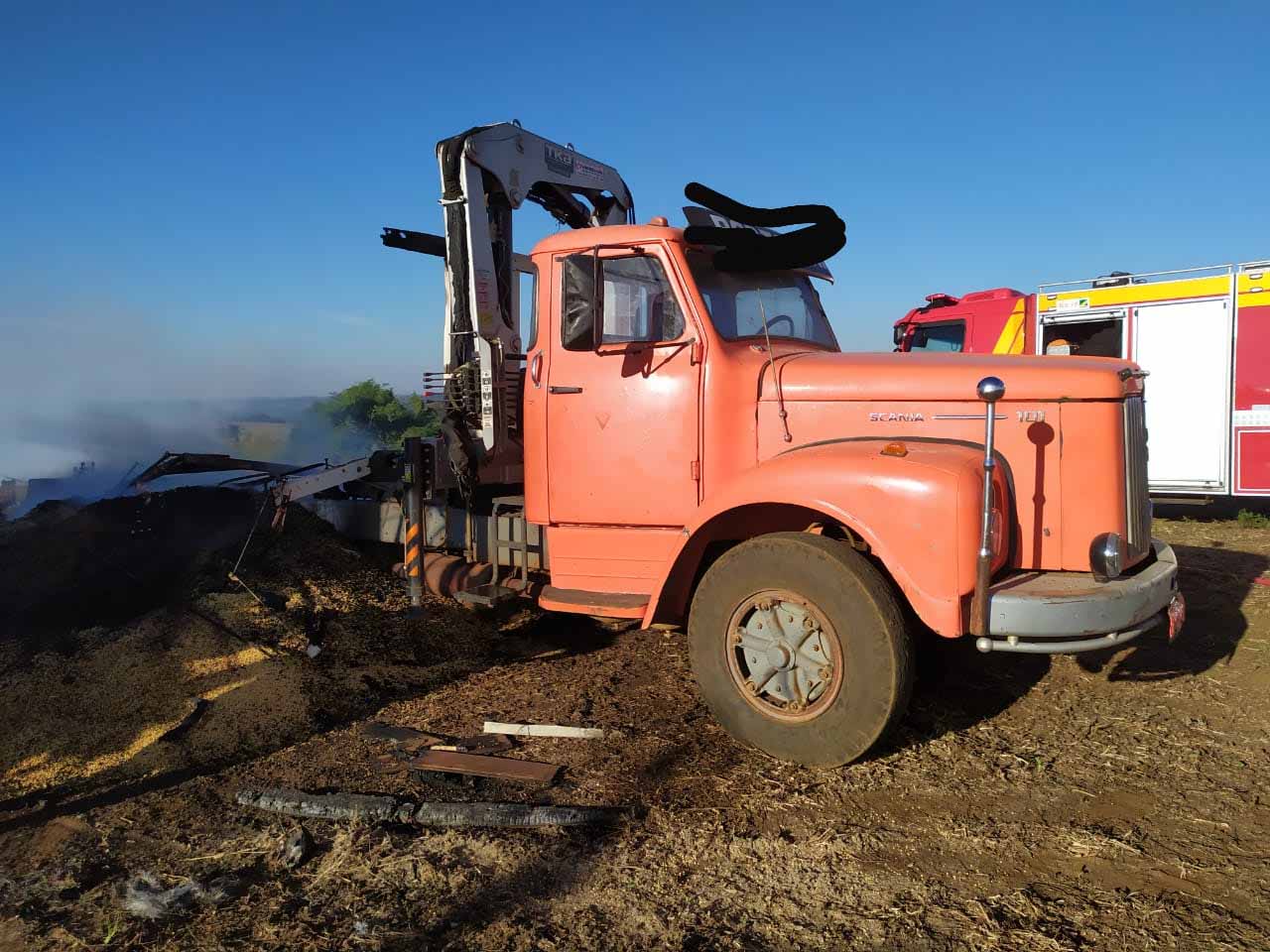 ocorrência de incêndio em colheitadeira e caminhão, localizados a 15 quilômetros