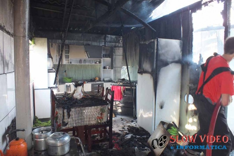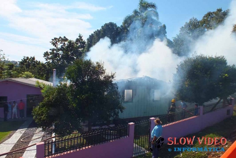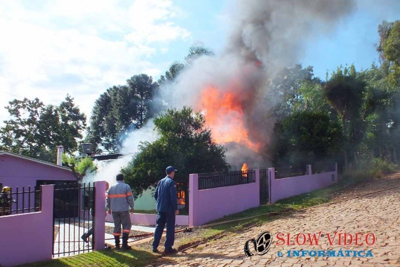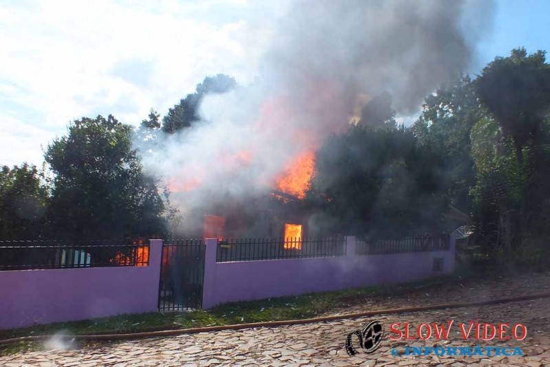 Por volta das 9:30 horas da manhã de hoje a residência de Nelson Almondi de 64 anos, casado, situada na rua Vereador Darci José Roman, centro de Campo Erê, foi totalmente consumida por um incêndio que, segundo informou a mulher começou no quarto do casal.<br><br>A casa mista de aproximadamente 100 metros quadrados, toda mobiliada foi destruída e com a chegada dos bombeiros, nada puderam fazer a não ser preservar outra casa próxima e extinguir as chamas. Foram gastos aproximadamente 15 mil litros de água e os prejuízos ainda não foram contabilizados pela família. <br><br>A mulher passou mal e foi conduzida ao hospital para atendimento. Ao receber a informação de que uma criança estaria no interior da residência um funcionário da CELESC se feriu ao auxiliar os bombeiros para estourar uma porta para adentrar a residência. A informação não foi comprovada posteriormente, pois a mulher e a criança haviam saído assim que perceberam o incêndio que será apurado pelos bombeiros e policia.<br><a href="http://www.slowvideo.com.br/fotos_noticia.php?id=4533"><b><br></b></a><br>